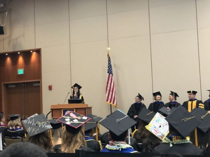 Audrey Nguyễn đọc diễn văn tại lễ tốt nghiệp. (Ảnh: Audrey Nguyễn cung cấp)