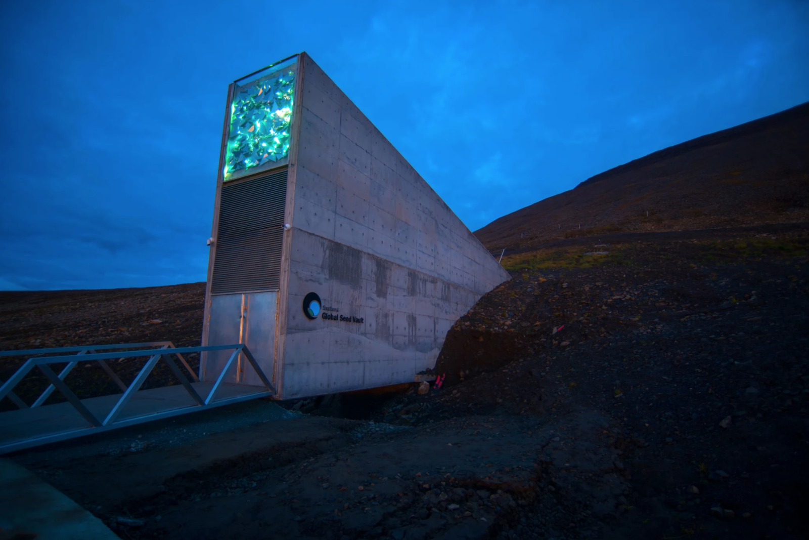 Trên đảo Spitsbergen của Na Uy, hầm chứa hạt toàn cầu nằm ẩn sâu bên trong một ngọn núi ở Bắc Cực. Căn hầm được xây dựng để bảo tồn sự đa dạng của cây lương thực thế giới. Kiến trúc này có thể tồn tại khoảng 200 năm, chịu được các trận động đất và những vụ nổ bom.