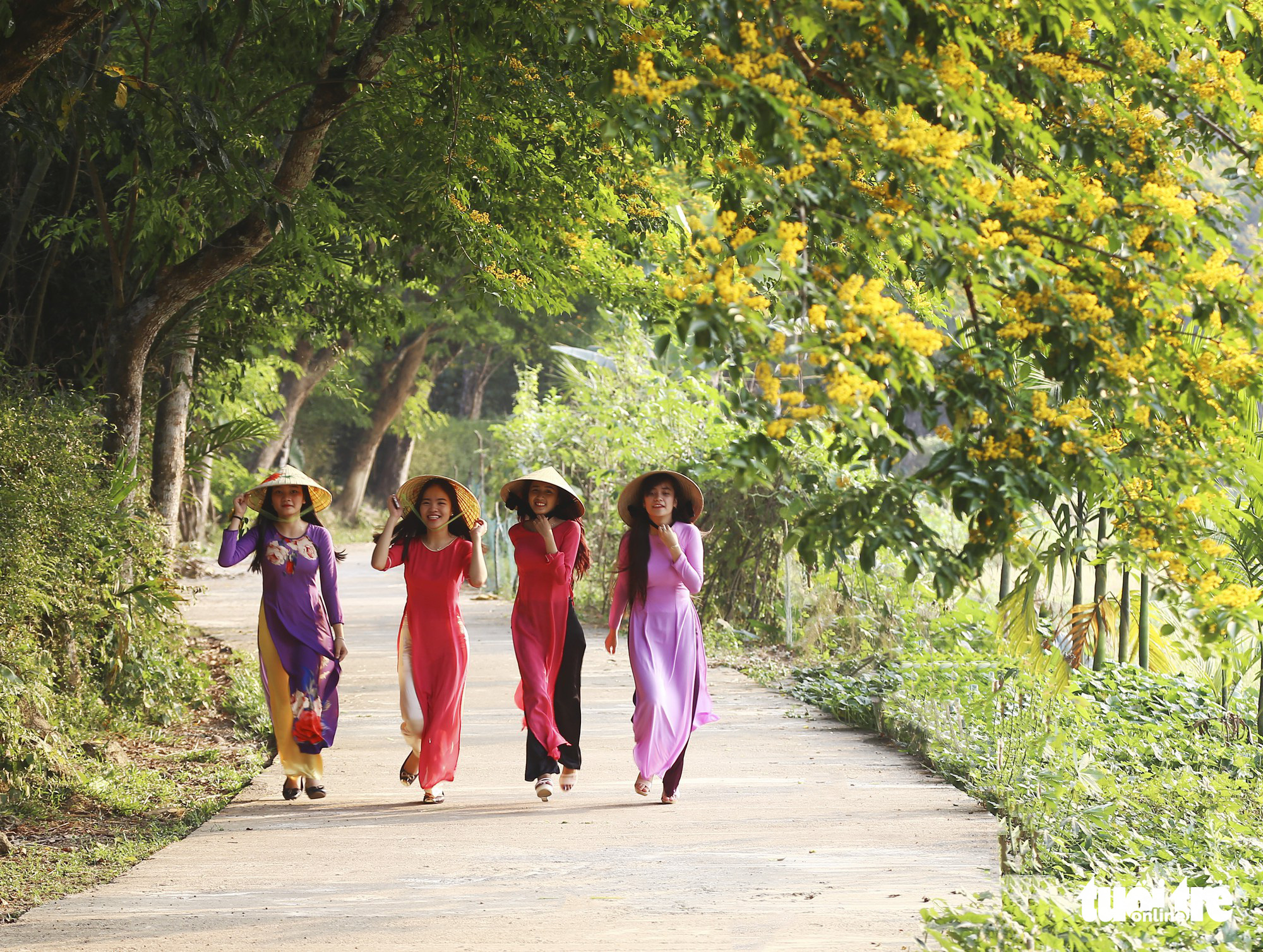 Những tà áo dài trên đường hoa sưa làng Tiên Mỹ - Ảnh: VŨ CÔNG ĐIỀN
