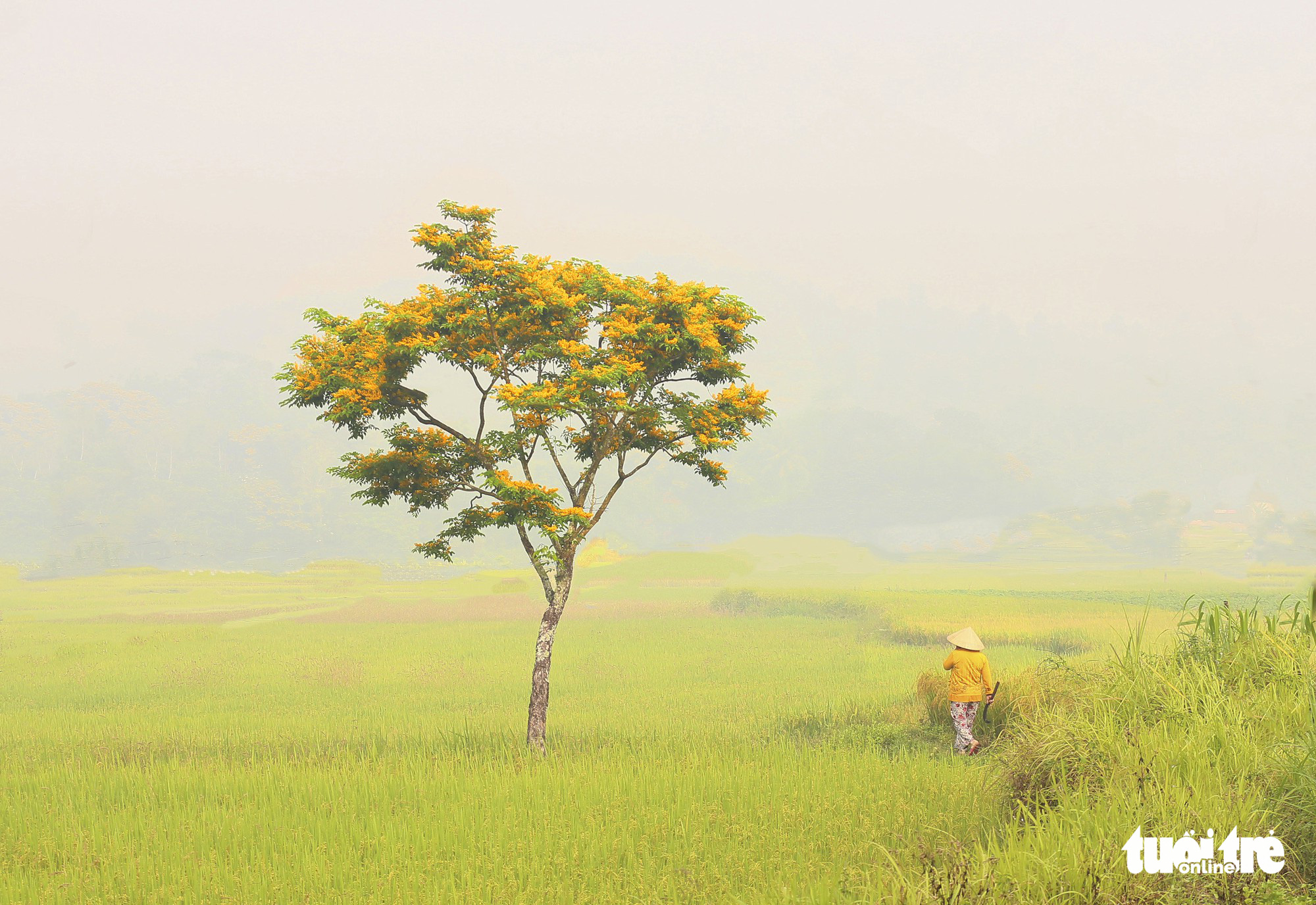 Trên đường đến chợ huyện, hoa sưa nở vàng trong sương sớm - Ảnh: VŨ CÔNG ĐIỀN