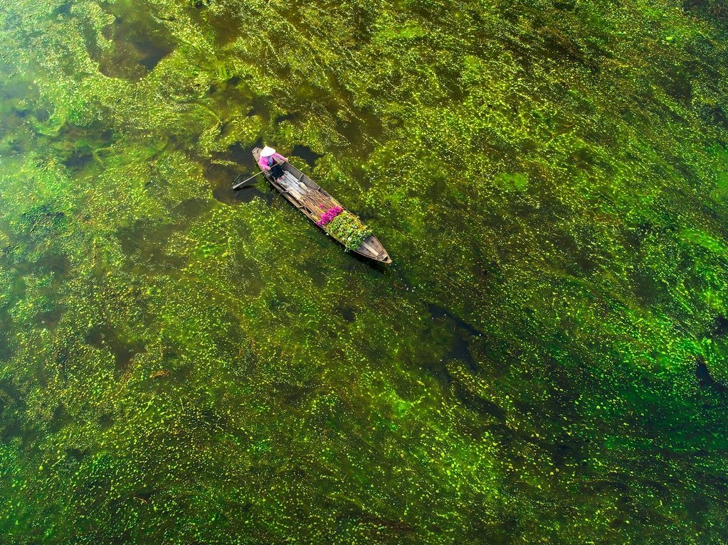 Người phụ nữ hái hoa súng, xung quanh là mảng bèo xanh nổi trên mặt nước tại Tân An.