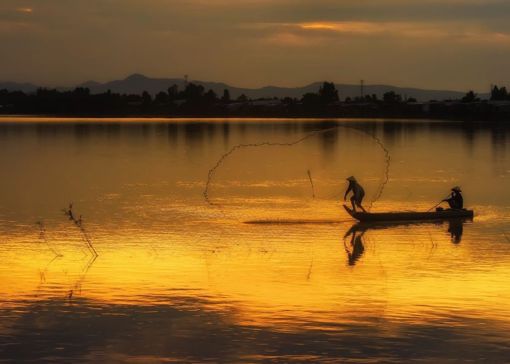 Ngư dân quăng chài đánh bắt cá trên cánh đồng Châu Đốc, An Giang.