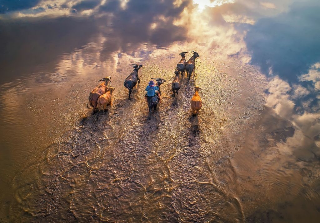 Đàn trâu băng qua đồng lũ trong buổi chiều ở Tân An, Long An.