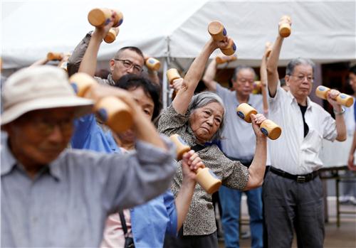 Cùng tập thể dục tại ngày hội Respect for the Aged Day ở một ngôi chùa tại Nhật, nơi có dân số cao tuổi nhất thế giới.