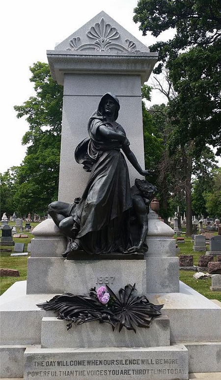 Đài tưởng niệm bảy nhân vật bị tử hình sau vụ Haymarket tại Chicago với câu nói cuối cùng của August Spies: “Một ngày kia sự im lặng của chúng tôi sẽ mạnh hơn tiếng nói mà các ngài đang cố dập tắt.” Nguồn: wikipedia